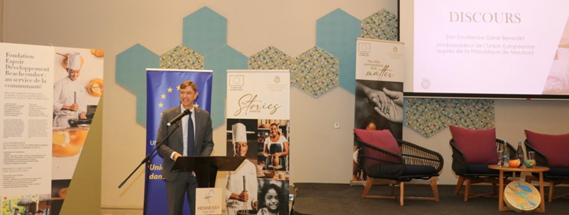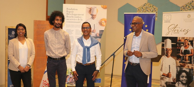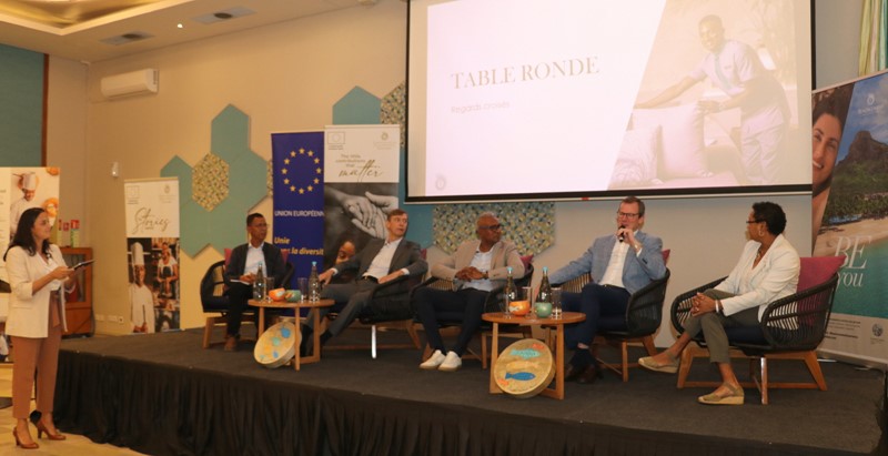 - Roundtable discussion "Converging Views," moderated by Karine Perrier Curé, with the participation of His Excellency Oskar Benedikt, Patricia Adèle Félicité, Secretary General of CARITAS Mauritius, Viren Vythelingum, CSR Manager of the Beachcomber Group and Edley Maurer, social worker and Manager of the NGO SAFIRE.
